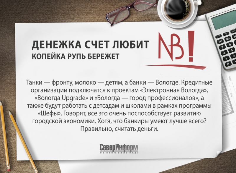 Танки — фронту, молоко — детям, а банки — Вологде. Кредитные организации подключатся к проектам «Электронная Вологда», «Вологда Upgrade» и «Вологда — город профессионалов», а также будут работать с детсадам и школами в рамках программы «Шефы». Говорят, все это очень поспособствует развитию городской экономики. Хотя, что банкиры умеют лучше всего? Правильно, считать деньги.