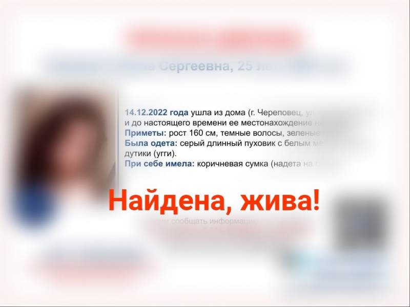 25-летняя горожанка жива и здорова. Изначально говорилось, что она пропала 13 декабря. Позже в ПСО «Ты не один» уточнили информацию: дата пропажи — 14 декабря. На следующий день к поискам подключились волонтеры.