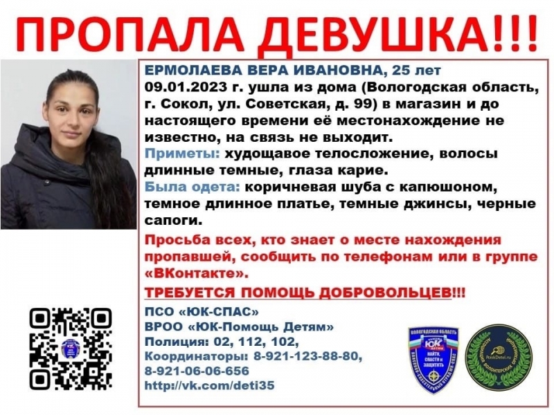 В Соколе девушка ушла в магазин и пропала Фото:ПСО "ЮК-СПАС"