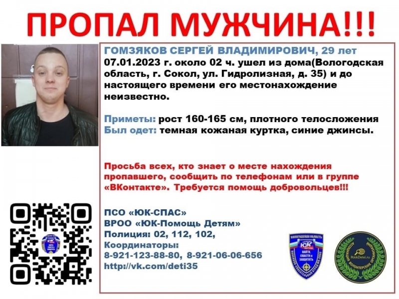 ПСО «Тотьма-Спас» опубликовал ориентировку на пропавшего. Всем желающим помочь в поисках можно обращаться по указанным там телефонам. В сообщении говорится, что нужна информационная поддержка.