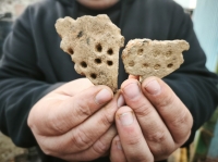 «Найденные материалы подтверждают, что в каменный век на этой территории существовали поселения. Фрагменты горшков из глины сделаны во времена, когда люди научились обжигать глину, превращая ее в твердое водонепроницаемое вещество. Это открытие позволило изготавливать прочную посуду, в которой можно было варить и жарить продукты, а также хранить их в течение долгого времени. Для этого времени характерны лепные керамические сосуды с прямыми стенками, округлым дном и орнаментом из ямок и отпечатков гребенчатого штампа», – пояснил фрагмент керамики Алексей Угланов.