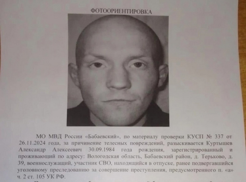 Сотрудники полиции ведут розыск подозреваемого. Ранее 40-летний мужчина сидел в тюрьме за убийство. Оттуда и ушел на передовую. В январе приехал в отпуск домой в Вологодскую область, где совершил новое преступление. Он может быть вооружен гладкоствольным ружьем и психически неуравновешен.