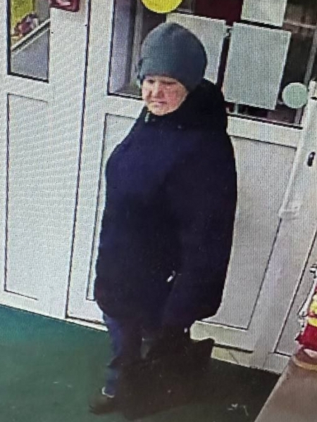 Женщина плотного телосложения, рост 150-155 см. Была одета в куртку до колена синего цвета, синие джинсы, черные ботинки, на голове шапка серого цвета, в руках черная сумка.