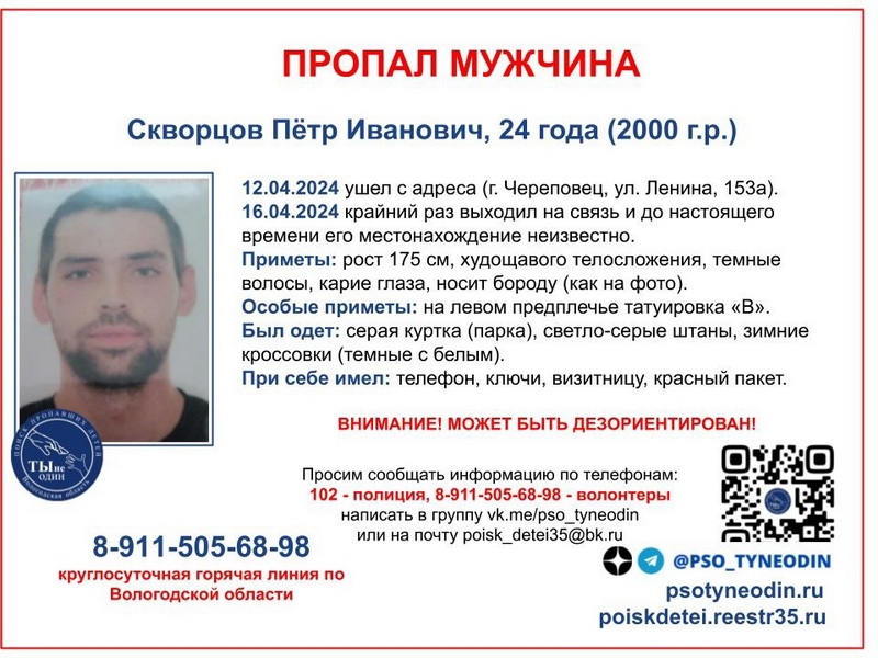 Из дома 24-летний Петр Скворцов ушел еще 12 апреля. Он живет в Череповце на улице Ленина. Мужчина болен, поэтому легко может потеряться, поэтому родные и обратились за помощью в группу поиска «Ты не один».