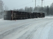 Судя по всему, водитель большегруза не учел погодные условия и не справился с управлением транспортным средством на повороте. Автомобиль занесло и перевернуло на бок.