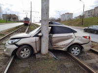 От удара первую иномарку откинуло на трамвайные пути, где автомобиль врезался в столб. Водителя с травмами доставили в областную больницу №2.