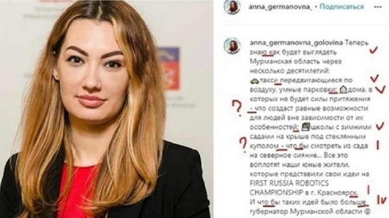 Недавно назначенный министр образования Мурманской области Анна Головина попала под шквал критики со стороны пользователей соцсетей. Поводом стал пост в ее Instagram-аккаунте, посвященный чемпионату робототехники и будущим техническим новинкам в регионе (полностью приведен на фото).