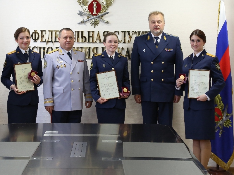 Золотые медали за успехи в учебе и службе сегодня из рук заместителя директора ФСИН России Олега Коршунова получили сразу три выпускницы Вологодского института права и экономики - Резеда Сакаева, Александра Галачинская и Полина Жукова.