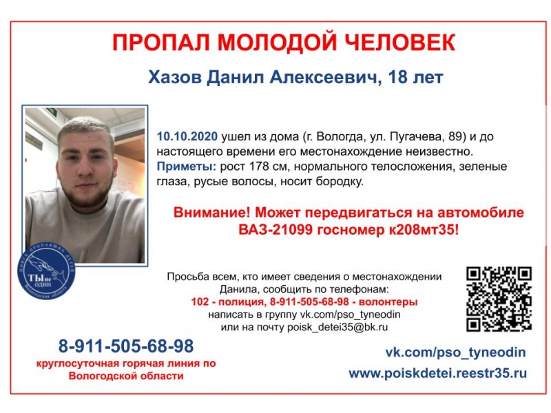 Всех, кто знает что-то о судьбе Данила Хазов, просят обратиться в полицию или к волонтерам по указанному номеру, сообщает ИА «СеверИнформ». |