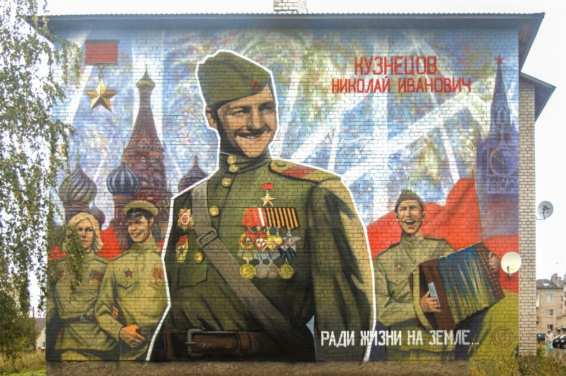Трехэтажеу красило гигантское граффити с изображением Николая Ивановича Кузнецова. Автор работы – художник Олег Иванов. Он трудился над рисунком на протяжении 3 дней.