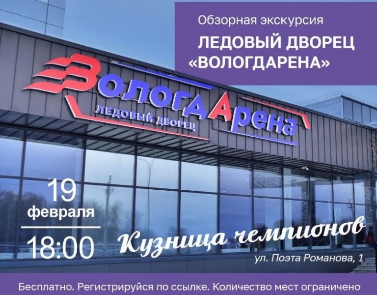 19 февраля в 18 часов приглашают побывать на «ВологдАрене», кузнице чемпионов. Она с блеском открылась чуть больше года назад. Еще 3 места удастся посетить 20 февраля. Афишу остальных экскурсий опубликуют позже.