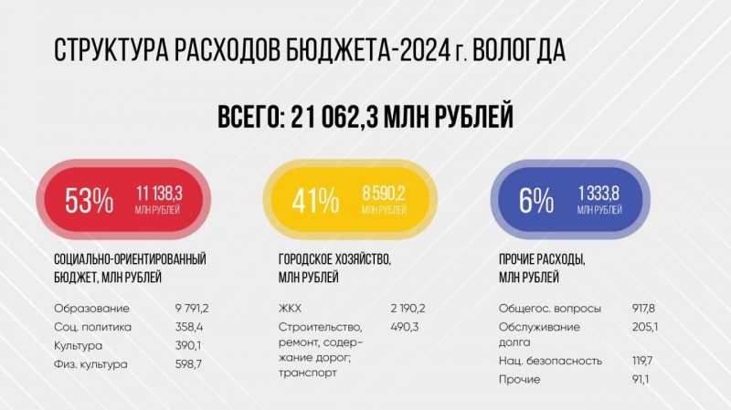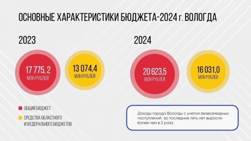 «Это бюджет развития, ориентированный на социальную сферу. Спасибо врио Губернатора области Георгию Филимонову за дополнительно выделенные 4,4 млрд рублей. Продолжаем работать дальше! А о том, что нами выбран правильный курс развития, говорит и то, что люди хотят жить и развиваться в Вологде! В этом году к нам переехали более 760 человек. Подробнее о структуре бюджета и самых крупных объектах, которые будут реализованы в 2024 году, в инфографике», - сказал мэр Сергей Воропанов.