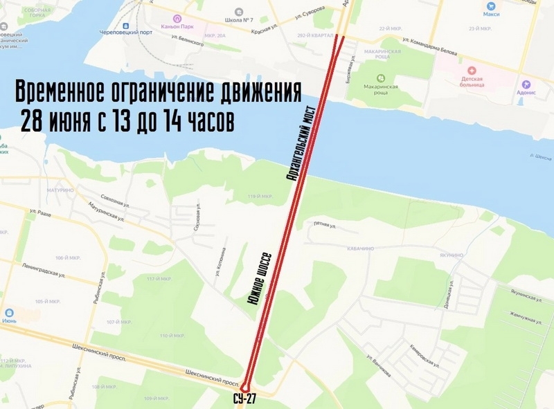 Поэтому в субботу с 4.00 до 18.00 часов будут полностью закрыты для движения Архангельский мост и Южное шоссе на всем протяжении, Шекснинский проспект от Рыбинской до Южного шоссе, Архангельская от Суворова до моста, а также Командарма Белова от Юбилейной до Архангельской.