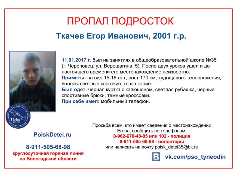 В Череповце пропал подросток Фото:vk.com/pso_tyneodin