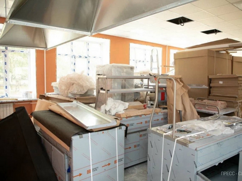 Работы продолжаются на пищеблоке. Пока еду привозят в контейнерах. Но так как детей стало намного больше после того, как добавились ученики 1-4 классов, то столовая стала необходимостью. Остался небольшой объем работ: доделать полы, потолки и настроить технику. Строителям надо уйти с объекта до конца этой недели. И уже со следующей дети будут питаться в нормальных условиях.