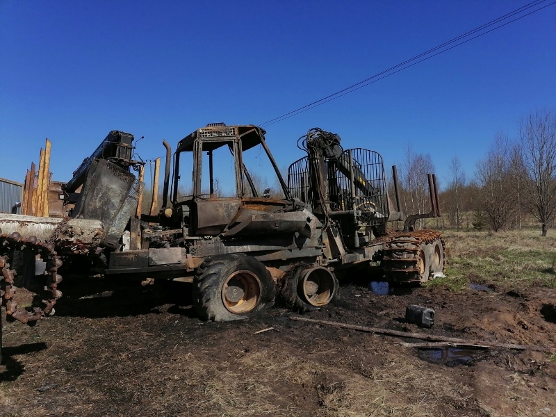 Подборщик леса воспламенился около деревни Пажицкая. Сообщение о пожаре поступило в 5:43 10 мая.
