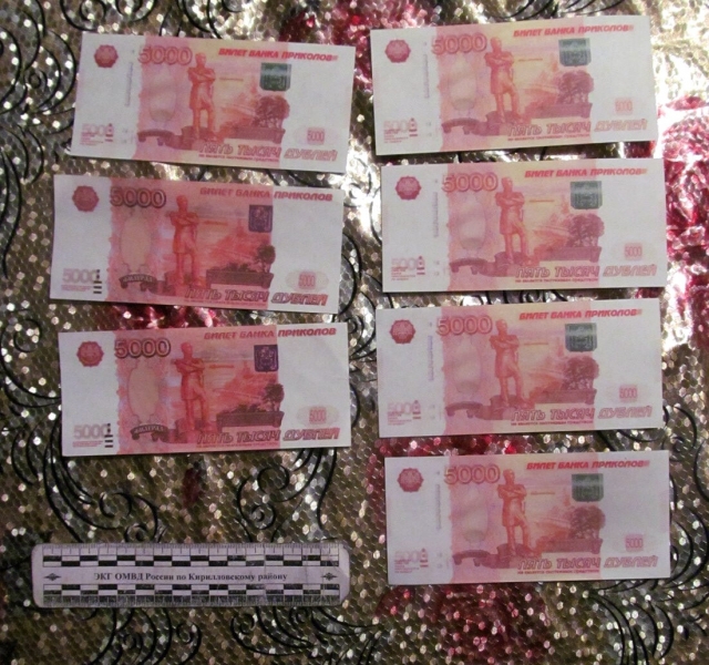 Полицейские отправились по адресу и изъяли 7 купюр по 5 тысяч рублей каждая. Они были очень похожи на настоящие, и пожилые люди с плохим зрением не сразу разглядели надписи «Билет банка приколов.