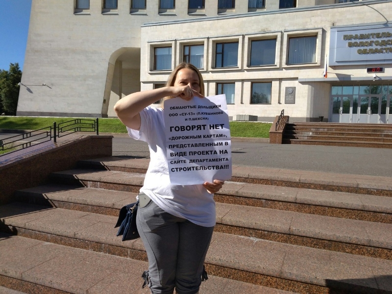 Сразу несколько пикетных акций прошли в Вологде. Обманутые люди выходили по одному к зданиям Правительства Вологодской области, Законодательного собрания и Департамента строительства. Последняя акция прошла 9 августа. Вологжане требуют выделения денег на окончание строительства дома на Сосновой, 2 и 6/8 в Кувшиново. Застройщик — компания «СУ — 13». Итогом пикетов стала договоренность о диалоге с заместителем губернатора Виталием Тушиным и депутатом ЗСО Денисом Долженко.