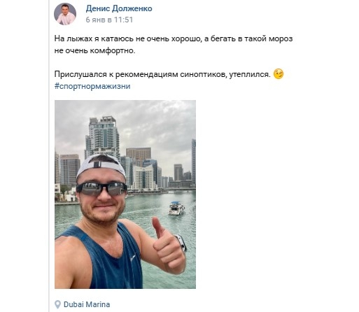 «На лыжах я катаюсь не очень хорошо, а бегать в такой мороз не очень комфортно. Прислушался к рекомендациям синоптиков, утеплился». С этого поста и фотографии на фоне небоскребов в ОАЭ началась одна из наиболее резонансных историй наступившего года. Рассказ о своем отдыхе опубликовал на странице «ВКонтакте» депутат Заксобрания Вологодской области Денис Долженко. Он известен, в том числе, как популяризатор спорта и здорового образа жизни.