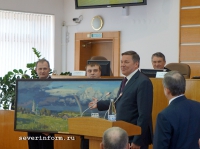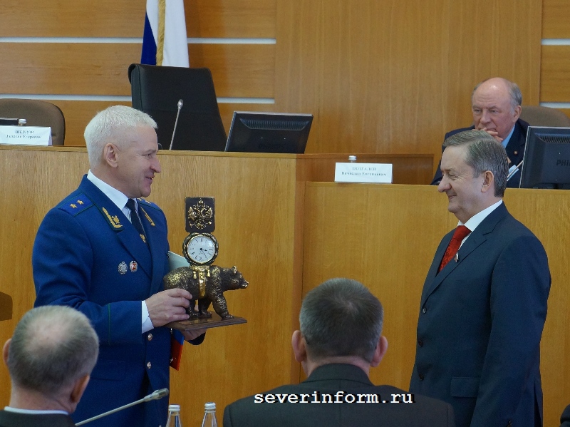 Прокурор области Сергей Хлопушин преподнес парламентариям часы в форме медверя