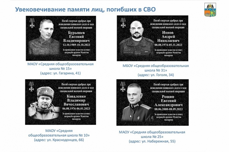 «Евгений Бурышев — рядовой, водитель-санитар медвзвода мотострелкового батальона. Окончил лесомеханический техникум, работал аппаратчиком. Был призван по мобилизации, погиб 10 октября. Андрей Ионов — старший лейтенант, замкомандира гаубичной артиллерийской батареи. Окончил наш военный университет, работал в школе № 31 учителем ОБЖ. Был призван по мобилизации, погиб 5 ноября. Владимир Коваленко — сержант, замкомандира взвода, командир боевой машины. Служил в налоговой, Госнаркоконтроле, уголовно-исполнительной системе. Был призван по мобилизации, погиб 6 января. Евгений Рощин — лейтенант, начальник расчета беспилотных аппаратов отдельной разведывательной бригады. Окончил наш военный университет. Погиб 8 сентября», — цитирует cherino заместителя мэра Наталью Стрижову.