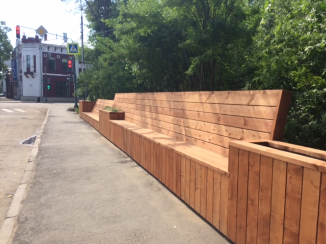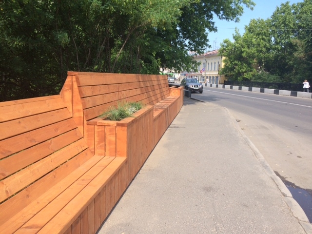 Тротуар на данном участке довольно узкий, но авторов проекта это не смутило. На каменном ограждении смонтированы конструкции из бруса, разной высотности. Скамейки с цветниками расположены «лицом» к проезжей части. Как пишет сайт «Вологда.РФ» такой подарок городу сделала частная компания, а спроектировали зону отдыха специалисты департамента градостроительства.