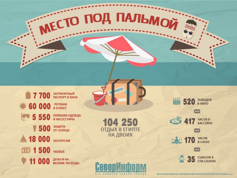 В сегодняшней «Практике относительности» корреспонденты агентства «СеверИнформ» подсчитали, во сколько обходится «место под пальмой» на побережье Красного моря. Ведь, по данным Ассоциации туроператоров России, Египет до сих пор находится на первом месте в списке наиболее востребованных запросов на туры россиян в 2014 году. Мы рассчитали примерную стоимость пребывания мужчины и женщины в стране пирамид и фараонов в течение десяти дней со всеми сопутствующими расходами.
