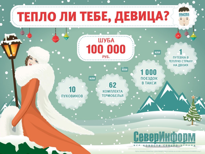 Итак, желающие утеплиться могут на 100 000 рублей купить, например, 10 добротных пуховиков. Или 62 комплекта термобелья. А можно 1000 раз прокатиться в такси, и по холодной улиц идти не придется. Ну и, в конце концов, можно на эти деньги отправиться вдвоем в жаркую страну, и в течение всего года после отпуска вас будут греть не менее теплые воспоминания. |