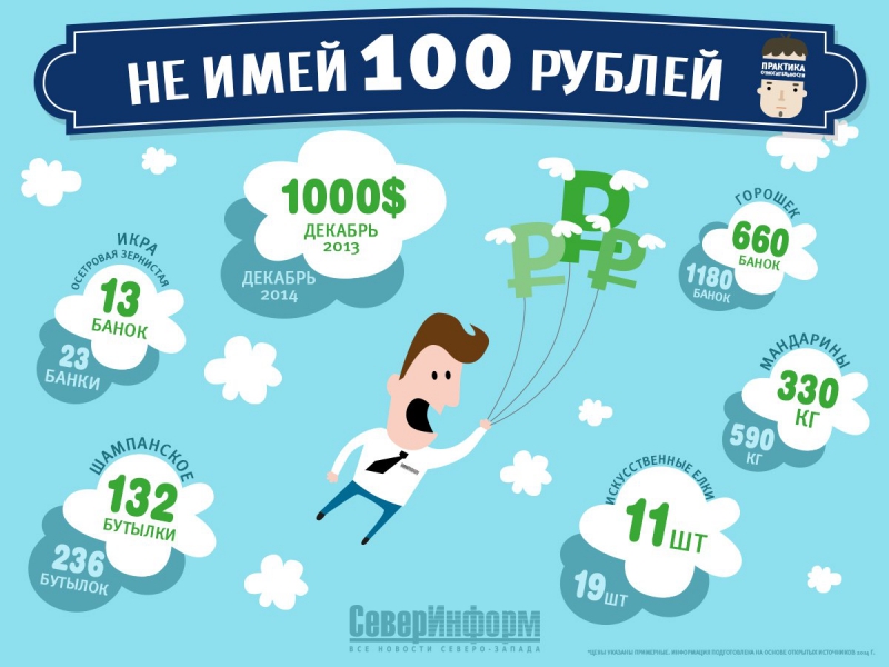 К примеру, в прошлом году на тысячу "зеленых" можно было купить 11 искусственных елок (стоимостью 3000 рублей), 330 килограммов мандаринов (примерно 100 рублей за килограмм), 132 бутылки "Советского" шампанского (250 рублей за бутылку), 13 баночек черной зернистой икры (примерно по 2500) и 660 банок консервированного горошка (порядка 50 рублей за банку). В этом же году обладатели такого количества "баксов" могут чувствовать себя настоящими богачами. Теперь на них можно приобрести целых 19 елок, 590 килограммов мандаринов, 590 бутылок игристого, 23 баночки икры и 1180 банок горошка.