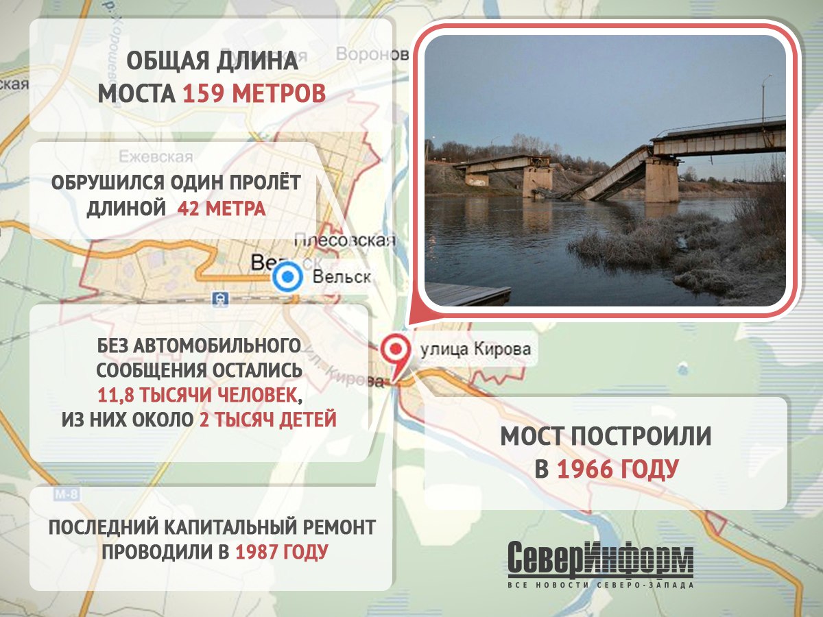 Напомним, железобетонный мост через реку Вага обрушился в ночь на 21 октября. Без автомобильного сообщения остались около 12 тысяч человек.