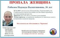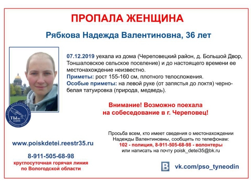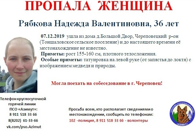 Сбор назначен на 15 декабря. 36-летняя Надежда Рябкова ушла из деревни Большой Двор Череповецкого района еще 7 декабря. Возможно, женщина отправилась в Череповец на собеседование.