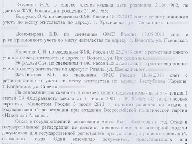 Отказ Минюста изложен убористым почерком сразу на нескольких страницах. Я бы хотел остановиться всего на двух. Выбор прост — именно на них отражены «косяки» вологодских активистов. Четверо из них решили обмануть государственную регистрационную машину. Что характерно, попались на лукавстве «сливки» оппозиции.