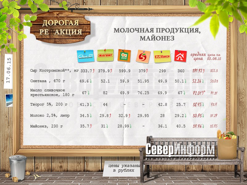 Милости просим на молочные реки, только вот насчет сыра лишний раз призадумаешься. А, может, и не надо его в магазине брать? Может, это блажь поверх колбасы еще кусочек Костромского взгромоздить? Он нынче лидер среди молочной продукции. За неделю вырос на 33 рубля, может быть, коровы нежные и привередливые стали, а, может быть, сам сыр метит в деликатес и роскошь попасть. Масло сливочное подорожало, не пугайтесь, всего на 30 копеек, по сравнению с сыром - это мелочи жизни. Ну а в остальном ситуация очень даже ничего, так или иначе цена сметанки, молока и творога радует.