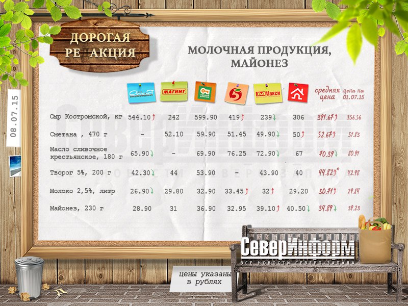 Очень любопытна разница в цене за Костромской сыр. Видимо, в некоторых магазинах под маркой «Костромской сыр» прячутся элитные твердые сорта французского. Ну а что вы хотели - санкции санкциями, а товар реализовывать нужно!