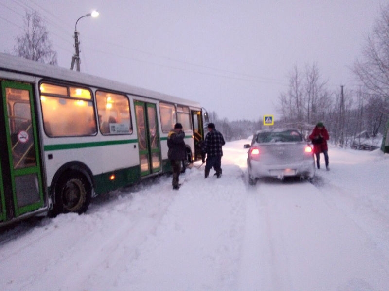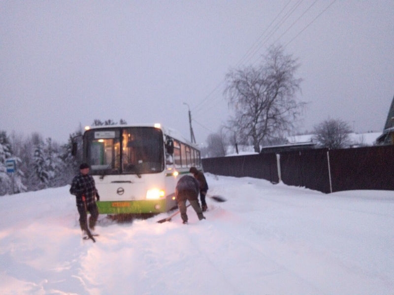 пассажиры вытолкнули рейсовый автобус из сугроба