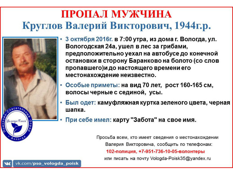 В Вологодском районе пропал Круглов Валерий Викторович. 3 октября в 7 часов утра мужчина вышел из дома в городе Вологде по улице Вологодская, 24а и отправился в лес за грибами. Предположительно уехал на автобусе в сторону Баранково до конечной остановки. С тех пор о нём ничего неизвестно.