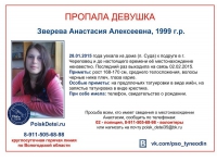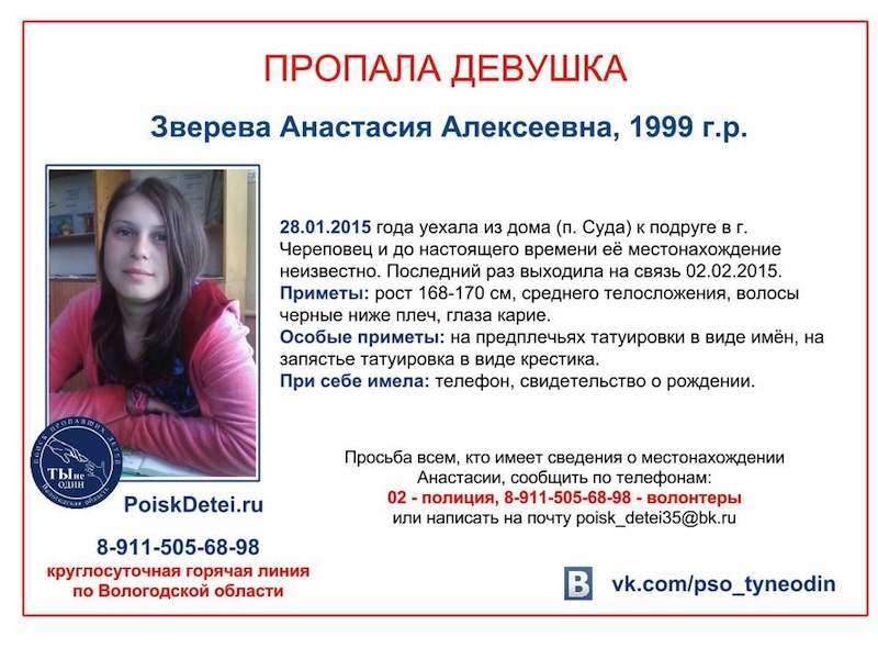 Рост девушки 168-170 сантиметров, телосложение среднее, черные волосы ниже плеч, карие глаза. У Анастасии есть татуировки: на предплечьях в виде имен и крестик на запястье, сообщает ИА "СеверИнформ" со ссылкой на поисково-спасательный отряд "Ты не один".