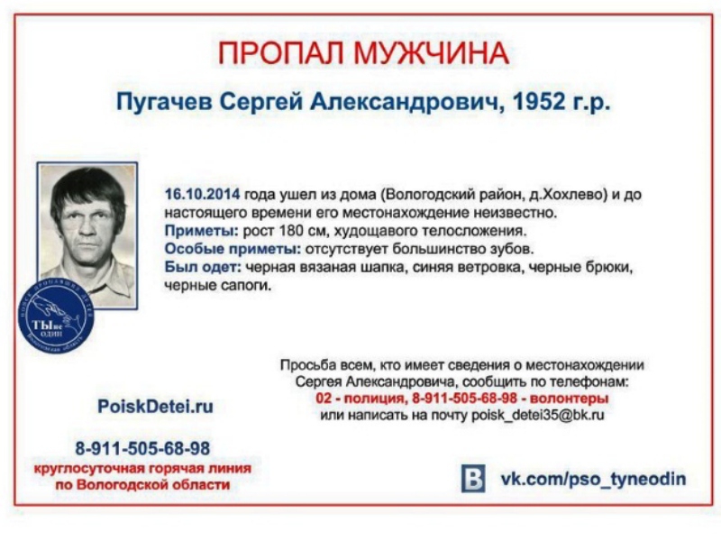 Еще один мужчина ушел из дома в деревне Хохлево Вологодского района в середине октября. С тех пор о нем ничего неизвестно. Сергею Пугачеву 62 года, он имеет худощавое телосложение. Рост мужчины — 180 сантиметров. В день исчезновения на нем была черная вязаная шапка, синяя ветровка, черные брюки и черные сапоги. У пенсионера практически нет зубов.