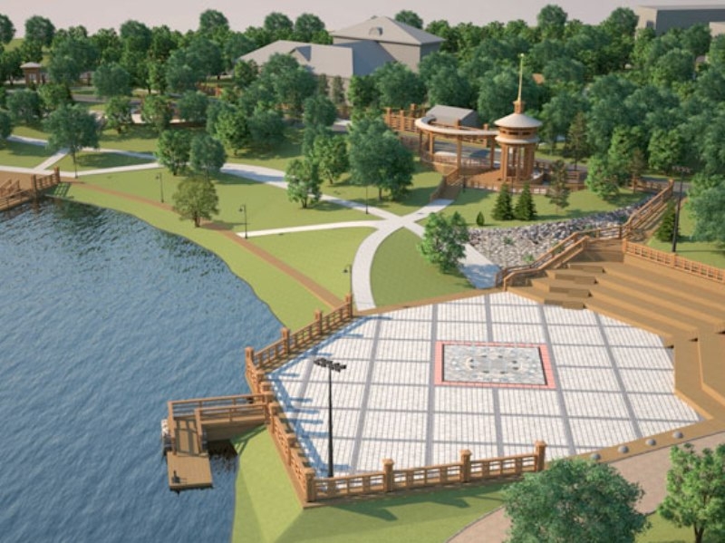 Перед входом появится арка с небольшим павильоном для обслуживания веломаршрутов. А в центре площадки возведут фонтан и уникальную деревянную ротонду с балюстрадой.