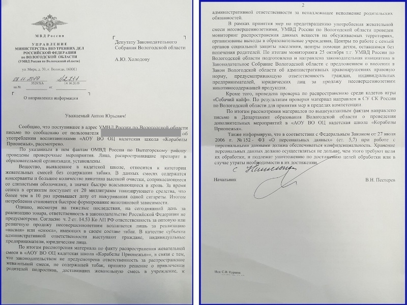 «Очень правильно, на мой взгляд, было бы наказать ещё и тех, кто продал эти никотиновые смеси детям, - заявил Антон Холодов. - Сейчас наказывают только за продажу табака несовершеннолетним, однако смеси, которые употребляли школьники в Вытегре, не менее опасны. А по сути получилось, что те, с кого началась эта ужасная история, остались без справедливого наказания. Поэтому я считаю, что в закон нужно ввести административную ответственность за продажу несовершеннолетним никотиносодержащей продукции».